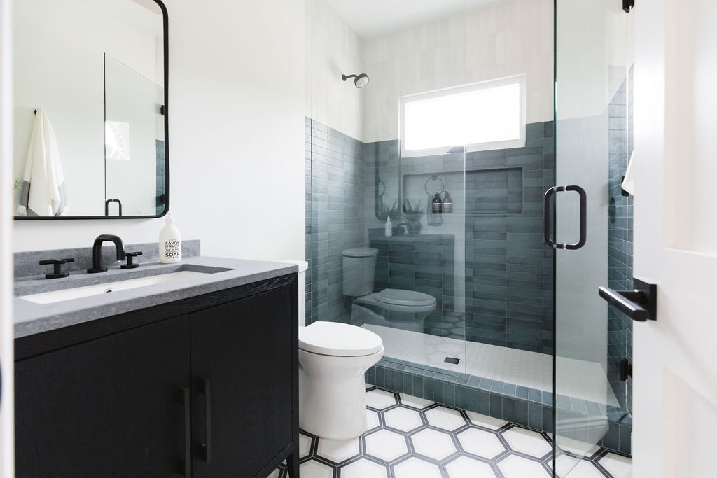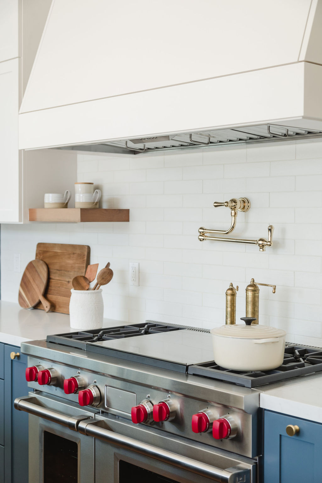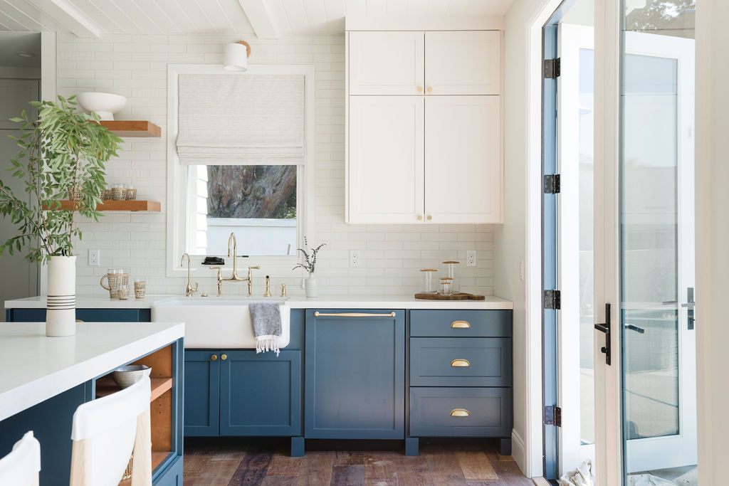 The kitchen is the heart of the home, featuring deep blue cabinetry, brass accents, and a large marble island for gatherings. Open shelving and carefully placed lighting create an airy, functional, and welcoming space.