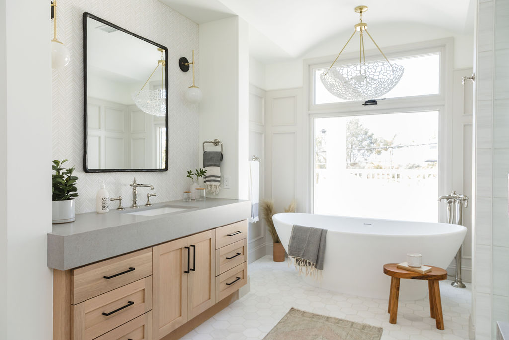 The bathrooms carry the same attention to detail, combining clean white finishes with natural wood cabinetry for warmth and balance. Spa-inspired elements—soaking tubs, walk-in showers, and timeless tilework—transform each bath into a private retreat. Expansive windows allow natural light to flood the interiors, enhancing the sense of calm and openness throughout.