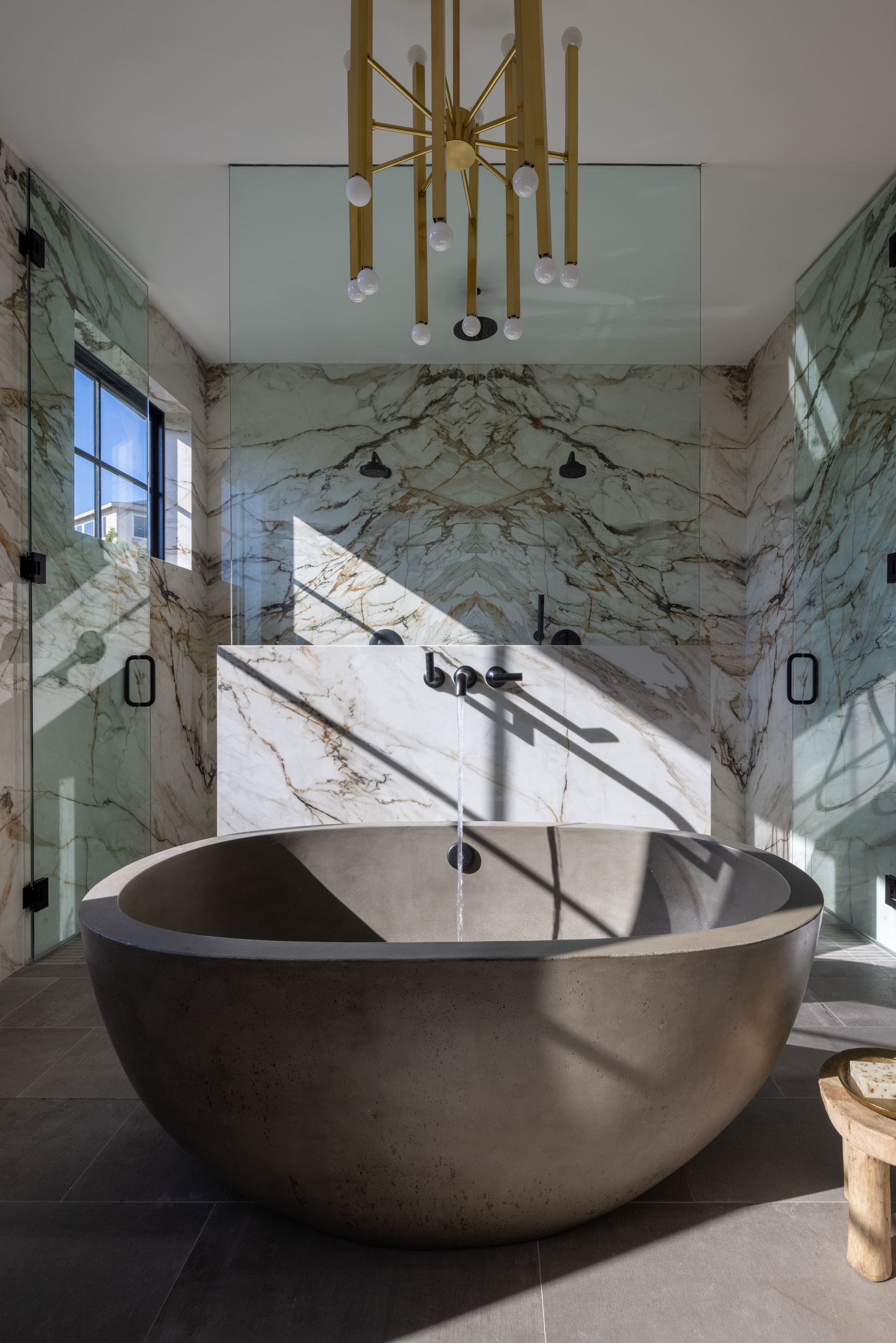 The home’s private spaces are equally refined, with serene bedrooms, spa-inspired bathrooms with dark colored finishes, and elegant design details like statement lighting and custom vanities. A striking mix of textures—from stone and wood to glass and metal—adds character and depth throughout. Practical touches, including a well-equipped laundry room and smart storage solutions, balance beauty with function.